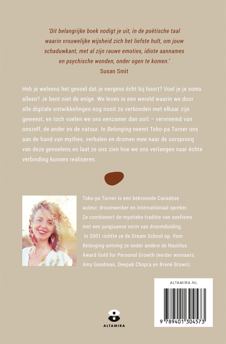 Toko-pa Turner is een bekroonde Canadese auteur, droomwerker en internationaal spreker. Ze combineert de mystieke traditie van soefisme met een jungiaanse vorm van droomduiding. In 2001 richtte ze de Dream School op. Voor Belonging ontving ze onder andere de Nautilus Award Gold for Personal Growth (eerder winnaars: Amy Goodman, Deepak Chopra en Brené Brown).