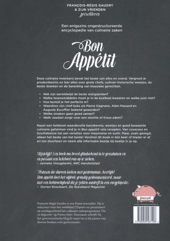Naast een heleboel waardevolle basiskennis, weetjes en goed bewaarde culinaire geheimen vind je in Bon appétit vele recepten. Van couscous en bouillabaisse tot aan variaties voor mayonaise en sushi. Maar, zoals gezegd, alleen het beste van het beste! Verslind dit boek in één keer of blader er af en toe doorheen en neem alle informatie beetje bij beetje in je op.
