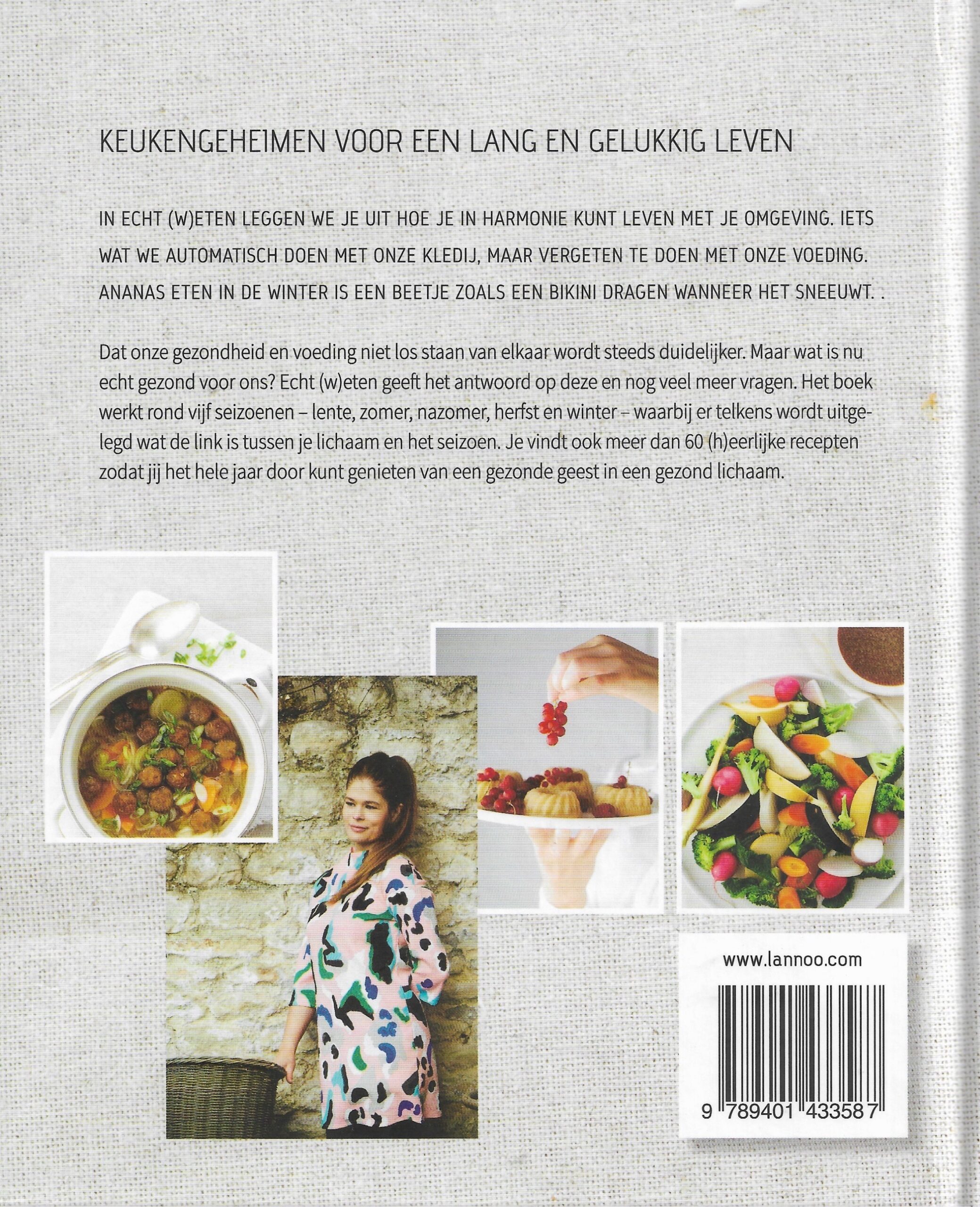 Dat onze gezondheid en voeding niet los staan van elkaar wordt steeds duidelijker. Maar wat is nu echt gezond voor ons? Echt (w)eten geeft het antwoord op deze en nog veel meer vragen. Het boek werkt rond vijf seizoenen – lente, zomer, nazomer, herfst en winter -– waarbij er telkens wordt uitgelegd wat de link is tussen je lichaam en het seizoen. Je vindt ook meer dan 60 (h)eerlijke recepten zodat jij het hele jaar door kunt genieten van een gezonde geest in een gezond lichaam.