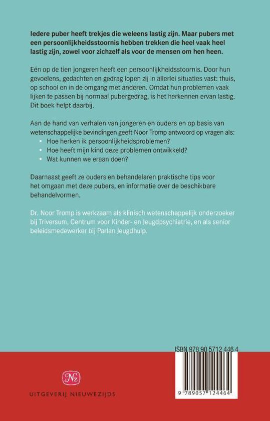 Eén op de tien jongeren heeft een persoonlijkheidsstoornis. Door hun gevoelens, gedachten en gedrag lopen zij in allerlei situaties vast: thuis, op school en in de omgang met anderen. Omdat hun problemen vaak lijken te passen bij normaal pubergedrag, is het herkennen ervan lastig. Dit boek helpt daarbij.