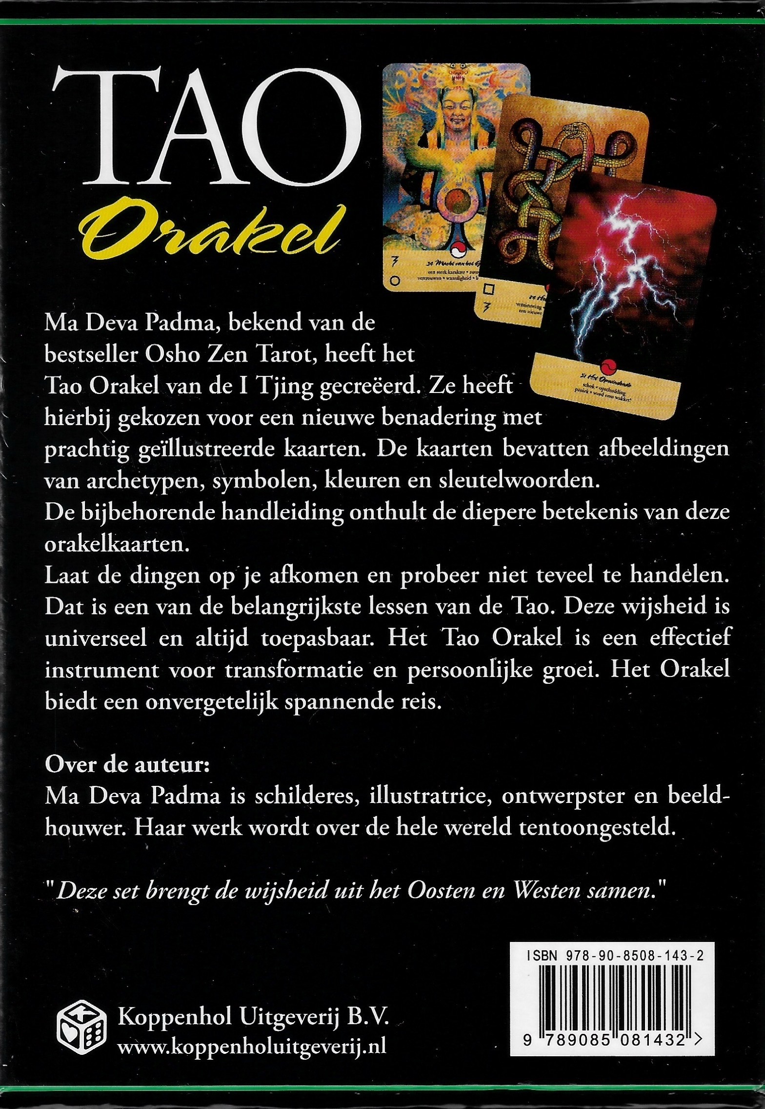 Ma Deva Padma, bekend van de bestseller Osho Zen Tarot, heeft het Tao Orakel van de I Tjing gecreëerd. Ze heeft hierbij gekozen voor een nieuwe benadering met prachtig geïllustreerde kaarten. De kaarten bevatten afbeeldingen van archetypen, symbolen, kleuren en sleutelwoorden. De bijbehorende handleiding onthult de diepere betekenis van deze orakelkaarten.