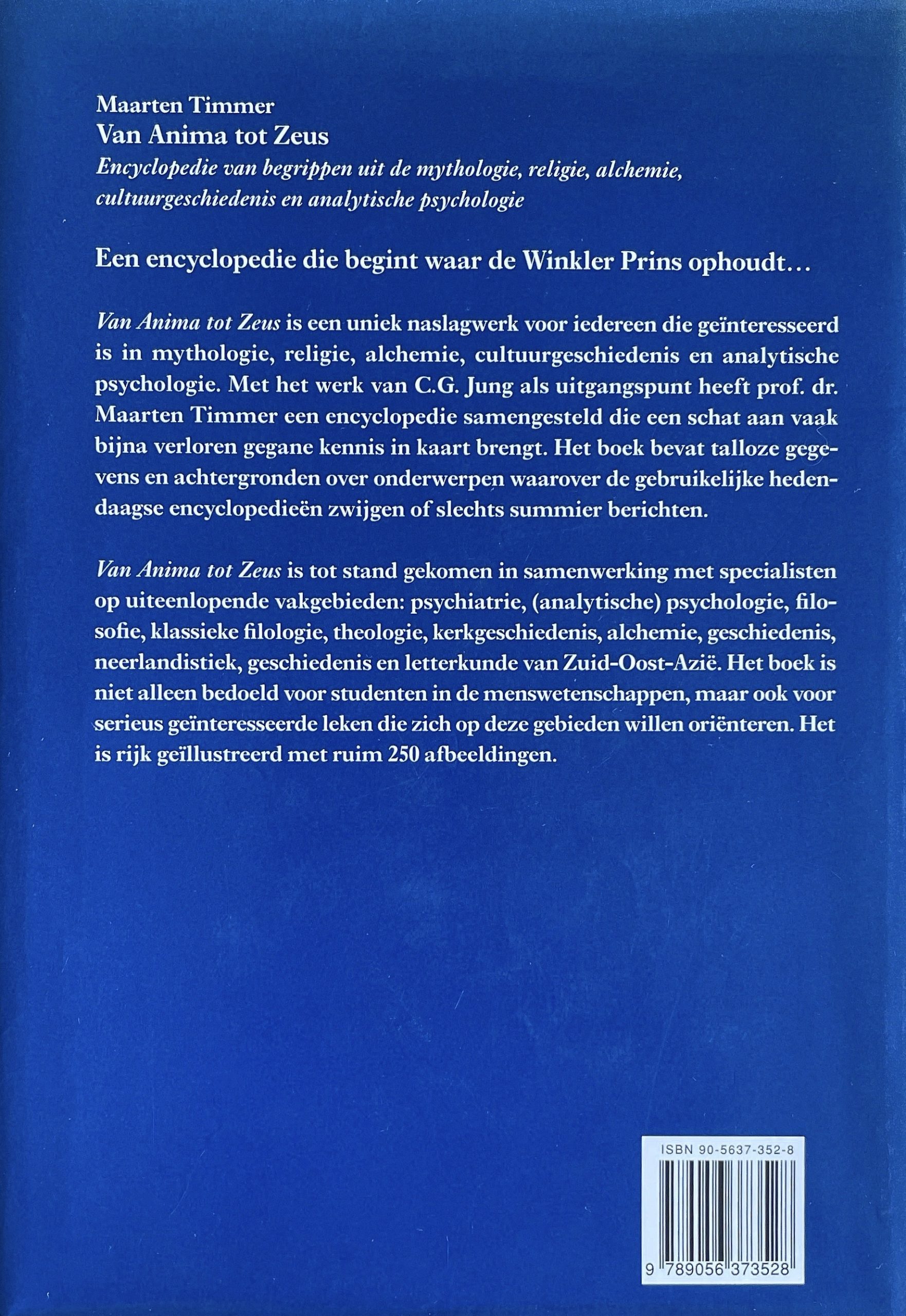 Wie heeft er nog grondige kennis van de bijbel en de geschriften van de kerkvaders? Wie weet er nog, meer dan oppervlakkig, iets van de Griekse, de Germaanse, de Egyptische, de Perzische mythologie? Wie kent de Upanishads en de boeddhistische geschriften? Om nog maar te zwijgen van het werk van de gnostici en de alchemisten. De belangstelling is er wel bij velen van ons, maar wanneer we teksten lezen hebben we vaak onvoldoende kennis van de achtergronden van bepaalde begrippen. Het is de verdienste van Maarten Timmer dat hij een naslagwerk over zeer uiteenlopende kennisgebieden heeft gemaakt dat verder gaat dan de gewone encyclopedie. Meer dan tien jaar heeft hij, gesteund door een team van deskundigen op verschillende vakgebieden, aan deze encyclopedie gewerkt. Dit heeft geleid tot een boek waarin een schat aan vaak bijna verloren gegane kennis is opgenomen, aangevuld met prachtig illustratiemateriaal. Van Anima tot Zeus is een fascinerend boek over de wortels van onze beschaving.