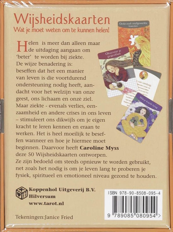 Helen is meer dan alleen maar de uitdaging aangaan om ‘beter’ te worden bij ziekte. De wijze benadering is: beseffen dat het een manier van leven is die voortdurend ondersteuning nodig heeft, aandacht voor het welzijn van onze geest, ons lichaam en onze ziel. Maar ziekte – evenals verlies, eenzaamheid en andere crises in ons leven – stimuleert ons dikwijls om je eigen kracht te leren kennen en eraan te werken. Het is heel moeilijk te beseffen wanneer en hoe je hiermee moet beginnen. Daarvoor heeft Caroline Myss deze 50 Wijsheidskaarten ontworpen. Ze zijn bedoeld om steeds opnieuw te worden gebruikt, net zoals het nodig is om je leven lang te proberen je fysiek, spiritueel en emotioneel niveau gezond te houden.